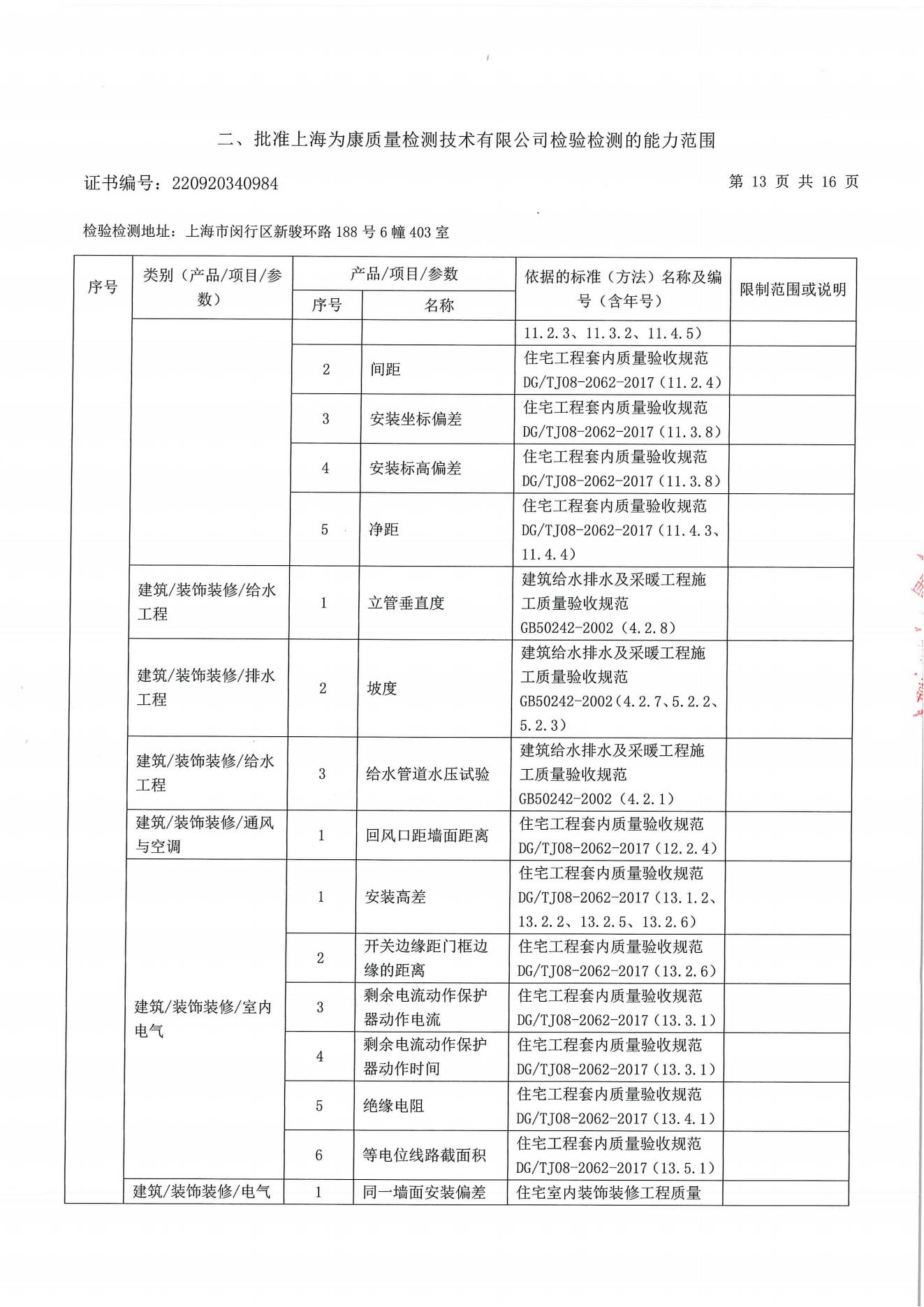 分戶驗收要求 分戶驗收:即交房前依照相關標準對區域內住宅逐套進行驗收。自2009年10月1日起所有上海市住宅工程強制實施分戶驗收。《上海市工程質量分戶驗收管理規(guī)定》住宅工程竣工驗收前必須依照《住宅工程套內質量驗收規(guī)范》DG/TJ08-2062-2009和現行工程質量標準、規(guī)范,對每戶套內的觀感質量、使用功能及使用安全進行驗收。凡未實施分戶驗收的,該工程項目將不得交付使用;服務范圍 一、裝修房全過程跟蹤檢查:從毛坯到裝修結束全過程跟蹤檢驗;對隱蔽工程施工進行檢測;對裝飾 材料進行控制;每個施工節(jié)點作好原始記錄并提出整改意見;待整改結束進行復查,直至符合 要求;最終每戶出具一份檢測報告。 二、裝修房竣工驗收:主要對安全、使用功能及表面觀感質量進行檢測;每個施工節(jié)點作好原始記錄并提出整改意見;待整改結束進行復查,直至符合要求;最終每戶出具一份檢測報告。 三、毛坯竣工驗收:主要對安全、使用功能及表面觀感質量進行檢測;每個施工節(jié)點作好原始記錄并提出整改意見;待整改結束進行復查,直至符合要求;最終每戶出具一份檢測報告。 四、個人交房驗房檢測。 建設工程分戶驗收檢測參考標準 DG/TJ08-2062-2017 《住宅工程套內質量驗收規(guī)范 》 DB/T 31/30-2003《住宅裝飾裝修驗收標準》 GB50209-2002《建筑地面工程施工質量驗收規(guī)范》 GB50210-2001《建筑裝飾裝修工程質量驗收規(guī)范》 GB20242-2002《建筑給排水及采暖工程施工質量驗收規(guī)范》 GB50300-2001《建筑工程施工質量驗收統一標準》 GB50303-2002《建筑電氣工程施工質量驗收規(guī)范》 套內質量檢測(一房一驗)內容 檢測內容 建筑尺寸 室內地面:水泥砂漿地面、木、竹地板,板塊地面 室內頂棚:頂棚抹灰、吊頂工程 室內墻面:墻面抹灰、飾面板(磚)墻面、涂飾工程、裱糊工程、軟包工程 建筑門窗 樓梯與護欄 細部工程:櫥、柜,窗簾盒、窗臺板、門窗套、可折裝式隔斷、淋浴房 給排水與燃氣:室內給水、室內排水、衛生器具、燃氣管道 通風與空調:送排風和防排煙、空調工程、 室內電氣:燈具安裝、開關、插座,分戶配電箱、室內配線、等電位聯結 弱電工程:有線電視安裝工程、電話、信息網絡安裝工程,訪客對講安裝工程、安防報警系統 太陽能熱水系統 室內環(huán)境評價